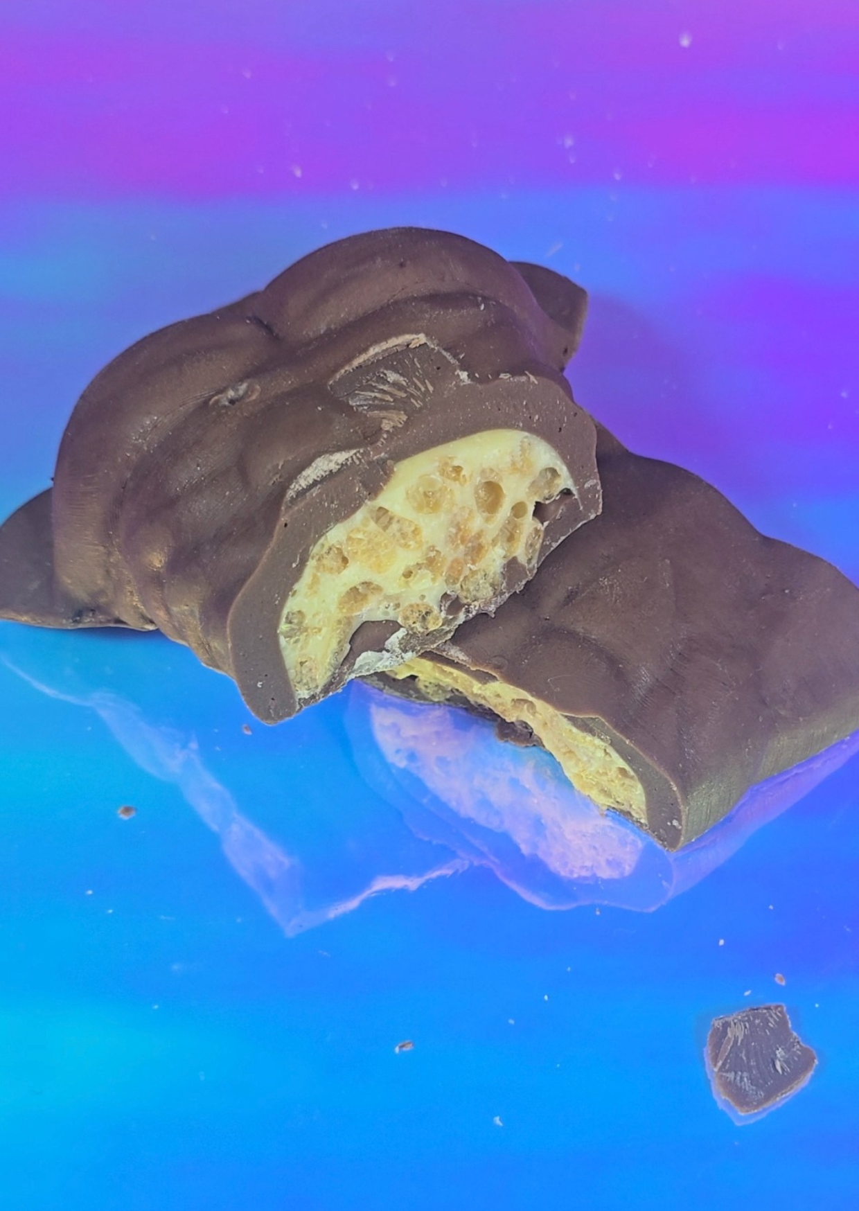 Ingrédients : chocolat au lait (pâte de cacao, sucre, lait entier en poudre, beurre de cacao, émulsifiant : lécithine de soja, extrait naturel de vanille), chocolat blanc (sucre, lait entier en poudre, beurre de cacao, émulsifiant : lécithine de soja, extrait naturel de vanille), riz soufflé